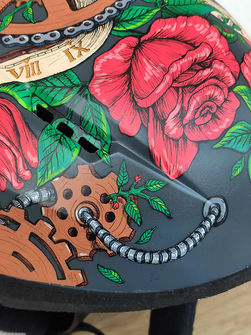 Angrenajele le-am desenat peste tot pe cască într-o culoare care aduce a ceva vechi, unele sunt suprapuse, altele sunt în contact ca și cum s-ar transmite o mișcare de rotație între ele. Am profitat de forma roților dințate și a cablurilor ca să ascund în design găurile laterale prevăzute pentru montarea vizierei.